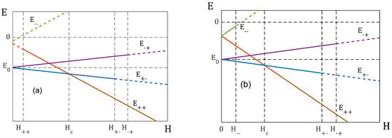 Energies of configurations , , and as a function of the strength of the field, : (a) the system does not meet conditions (10); (b) the system meets conditions (10). The solid lines mark the range of , where a configuration is a minimum, the broken lines mark the range where a configuration is not a minimum. Here, we use the following notations: , , and .