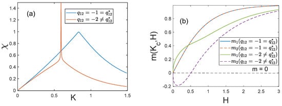 Changes in functions of physical quantities at the “critical” antiferromagnetic interaction: (a) susceptibility at ; (b) -dependences of partial magnetizations and at the critical temperature. The curves are drawn at . In panel (b), the curves merge when .
