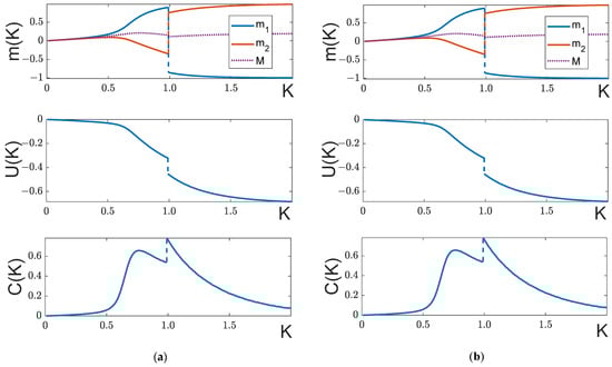 If , the shift of the critical point is accompanied by qualitative changes: at the critical point, a first-order phase transition replaces the second-order phase transition, which is accompanied by jumps in the magnetization and the internal energy (Figure 7d).