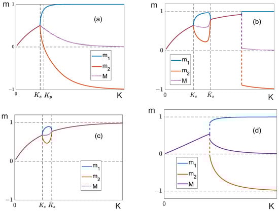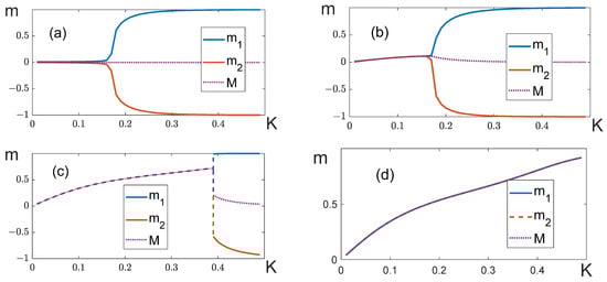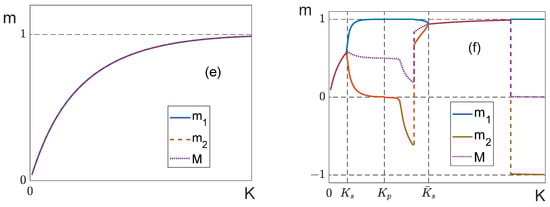 Since this system has a lot of free parameters, the overall picture of possible regimes is very diverse. Given a certain relation between the parameters of the model and the external field, there may be two first-order phase transitions and two second-order phase transitions (Figure 7f). The general behavior of the temperature dependences of the involved physical quantities, as well as determining the conditions under which various regimes occur, is a complicated problem that deserves to be considered in a separate paper.