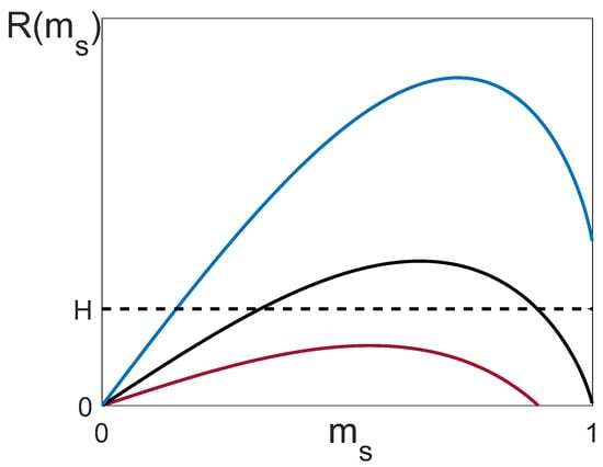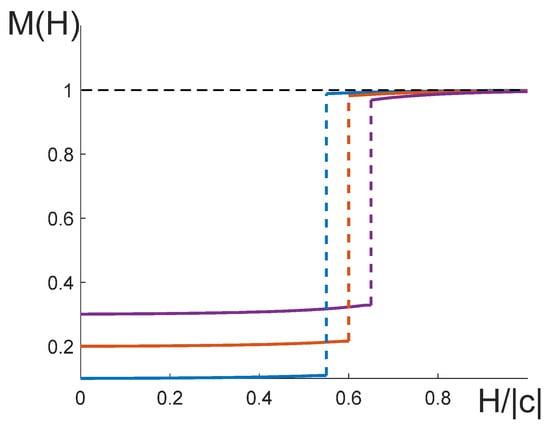 - The case (unbalanced system). Expanding the equations of state (6) in terms of the small parameters , , and extracting full magnetization , we obtain:whereIt is easy to see that the scaling hypothesis in this case is confirmed, because if , it follows from (16) that . Indeed, expression (25) can be represented in the classical form with the critical exponent and the scaling function of the form: