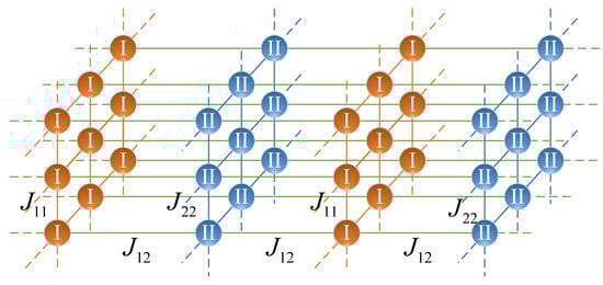 Magnetic properties of multilayer superlattices have been subject to intensive theoretical and experimental study. Special interest is given to multilayer structures consisting of thin layers of various ferromagnetic and antiferromagnetic materials [,,]. An example of such structures is designs with alternating ferromagnetic and non-ferromagnetic layers. In these structures, the thickness of the non-ferromagnetic layer can be chosen in such a way that the long-range exchange interaction between the ferromagnetic layers is antiferromagnetic []. This sort of structure has a giant magnetoresistance. Ferromagnetic layered structures with antiferromagnetic inter-layer interactions are theoretically investigated in [,] in the framework of the Heisenberg model. These studies reveal that this kind of system can have many distinct phases: ferromagnetic, antiferromagnetic, paramagnetic, and a whirling phase. Papers [,] consider the effect of weak interaction between two square Ising lattices on the phase transitions in this system. It is shown that if a structure has alternating layers of different ferromagnetic materials, there might exist a compensation temperature, which is a temperature below the critical value, at which the full magnetization of the lattice is zero. The conditions for the appearance of the compensation effect and the critical behavior of such systems near the compensation temperature are investigated in [,,,,,,]. In recent years, great consideration has been given to the study of spin systems with competing ferromagnetic and antiferromagnetic interactions, or with interactions between different groups of spins [,,,]. This sort of system usually has a complex landscape of free energy containing many local minima separated from the global minimum by a deep potential barrier.