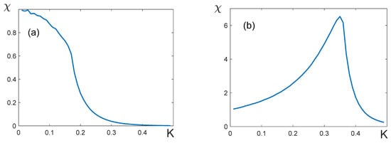 - Let us consider the temperature dependence of the susceptibility in the layered model in the absence of the external field: . If , i.e., , the form of the curve is independent of the lattice dimension, and the susceptibility takes a finite value at the critical point (Figure 11a,b). With large , the curve does not have a maximum (Figure 11a). It means that the critical exponents , which agrees with the numbers in Table 2.