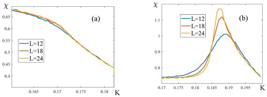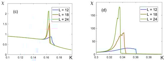 If , the susceptibility peak, as expected, is observed at the critical temperature (Figure 11c,d). The height of the peak increases with the lattice dimensions , which means that the susceptibility diverges at the critical point. This finding agrees with the classical critical exponents .