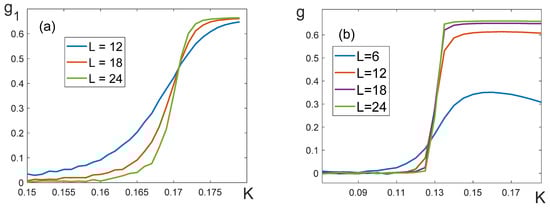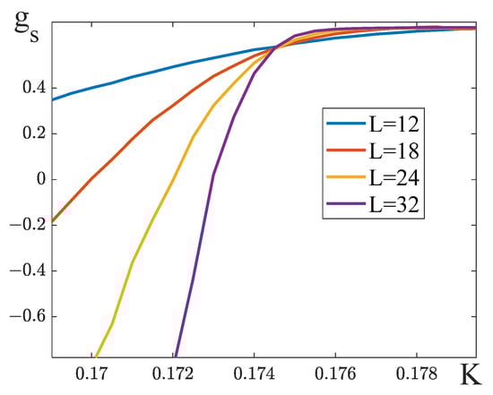 The temperature was determined as the point of intersection of the cumulants for lattices with various dimensions (Figure 14). We point out that the cumulants are usually used for determining the critical temperature of an antiferromagnetic phase transition []. The magnetization at the splitting point, , was calculated as the magnitude of the local maximum of magnetization for the lattice of the maximum size ().