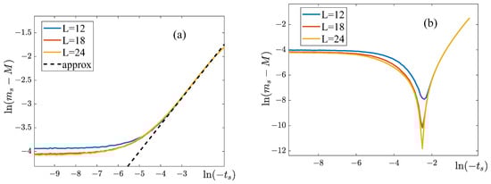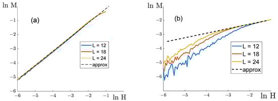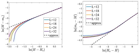 In order to determine the critical exponents and , we plotted the dependencies of on for the lattices with the dimensions ranging from to (Figure 17). Independently of the sign of , these curves have a linear asymptotic, the slope of which allowed us to extract the critical exponents (Table 4).