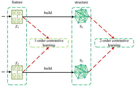 Instead of performing contrastive learning on the first-order contrastive similarity, we perform contrastive learning on the second-order contrastive similarity. Compared to contrastive learning on the first-order similarity, contrastive learning on the second-order similarity can provide a wider view. In a structure-based contrastive similarity matrix, denotes the structural similarity of node i and node j. Moreover, structure-based contrastive learning is based on the similarity matrix; therefore, it also implies a similarity of features. Inspired by [23], we implement contrastive learning as follows: