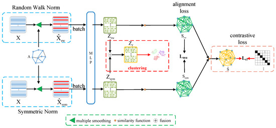 As a powerful tool, the Graph Neural Network (GNN) has been designed to deal with graph data such as social networks, knowledge graphs, citation networks, etc. The invention of the GNN has greatly facilitated graph-related tasks such as graph classification [1,2,3], neural machine translation [4,5], relation extraction [6,7], relational reasoning [8,9], and graph clustering [10,11,12]. Unlike traditional clustering methods such as K-means, GNN-based graph clustering models use deep neural networks for representation learning before clustering. Adaptive graph convolution (AGC) [11] is a method that can adaptively choose its neighborhood over various graphs. A deep attentional embedded graph clustering model (DAEGC) [13] can learn to aggregate neighbors by calculating their importance. The adversarially regularized graph autoencoder (ARGV) [14] introduces adversarial regularization to learn and improve the robustness of representations. The work on attributed graph embedding (AGE) [15] proposed a Laplacian filtering mechanism that can effectively denoise features. The deep fusion clustering network (DFCN) [16] is a hybrid method that integrates embeddings from autoencoder (AE) [17] and graph autoencoder (GAE) [18] modules for representation learning.