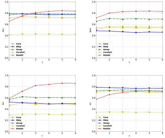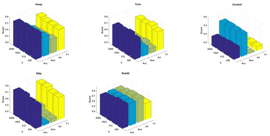In Figure 3, we show how the performance varied with changes in the batch size within the range of . From this figure, we can see that the performance fluctuation on the Amap, Cora, and Corafull datasets was not sensitive to changes in the batch size. However, a larger batch size enhanced clustering performance on Dblp; when the batch size was 1024, the clustering achieved the best results, whereas on Reddit, a smaller batch size was more beneficial for representation learning. This is because Dblp aggregated the first-order neighborhood for its representation, whereas Reddit aggregated the fifth-order neighborhood. A larger batch size facilitated the reduction of redundant relationships in Dblp but increased the risk of reducing useful relationships in Reddit.