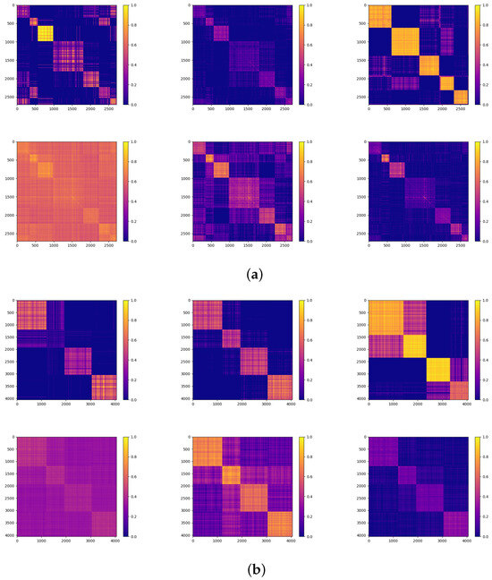 To demonstrate the effectiveness of our model in the clustering task, we illustrate a series of similarity matrices in Figure 5, showing the quality of the learned representations in each cluster. In Figure 5, we can observe that our model outperformed the other methods with respect to both the number of clusters and the clarity of the clustering structure.
