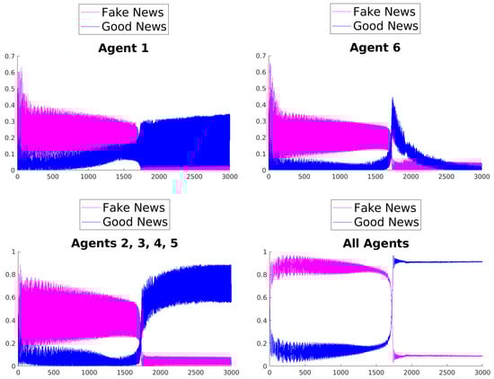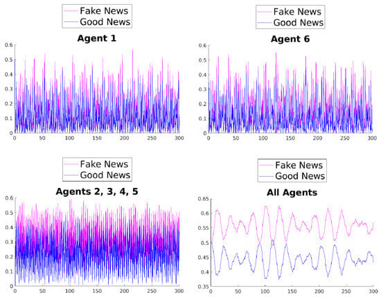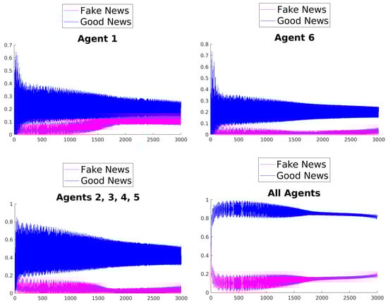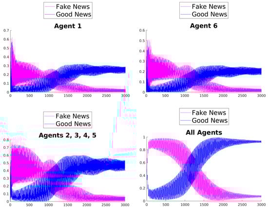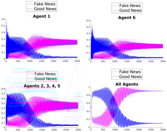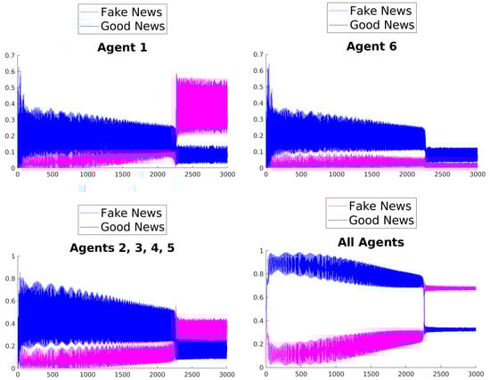 , meaning that there is a greater probability that the information arriving at Agent 3 will be changed from fake to good and a lower probability that Agent 4 will change from good to fake. This explains why the final asymptotic value of