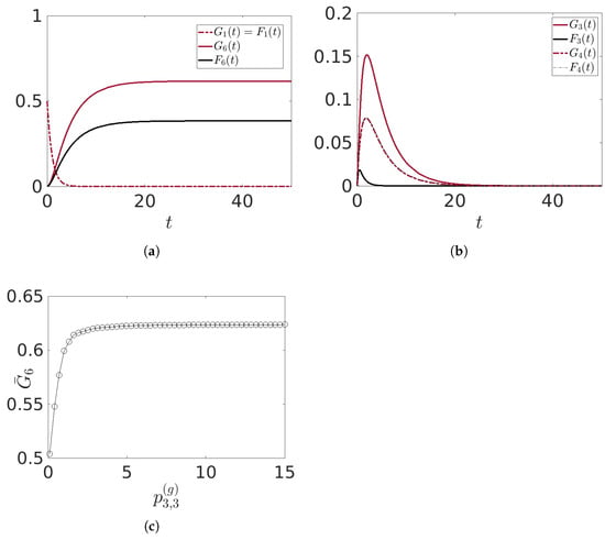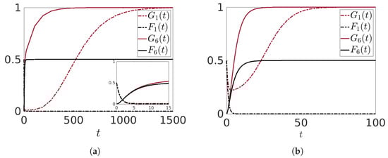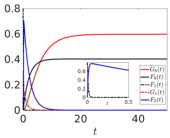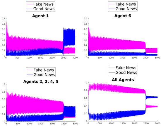 From this qualitative analysis, it is expected that, in our model, all the Lindblad operators operate in a chain driving the quantity of information contained in the first layer toward the last layer. Hence, as time goes on, the values of and in the first layer will decrease, while the other layers will increase their relative values. Ultimately, all the information will be contained in and , depending on the strength of the layers responsible for switching the information (in particular, Agents 3 and 4). In the following, we consider three different numerical experiments intended to show how it is possible to simulate different situations in which the news perceived by can be dependent on the mechanisms ruling the transmission in the middle layer.