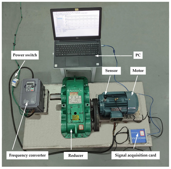 In order to verify the effectiveness of the method proposed in this paper, a three-phase asynchronous motor experimental platform was built. The three-phase asynchronous motor fault data experimental platform consists of five parts, namely, a motor (Model: YE3-10012-4 Zhejiang Jinsu Motor Co., Ltd., Taizhou, China), frequency converter (Model: VFD9000-G5R5/P7R5-T4 Zhejiang Xintuo New Energy Co., Ltd., Jinhua, China), signal-acquisition card (Model: YE6231C JiangSu Lianneng Electronic Technology Co., Ltd., Yangzhou, China), reducer (Model: JZQ250 Shandong Zibo Xinyuan Machinery Co., Ltd., Zibo, China), and sensor (Model: CAYD051V JiangSu Lianeng Electronic Technology Co., Ltd., Yangzhou, China); the experimental data acquisition platform is shown in Figure 2.