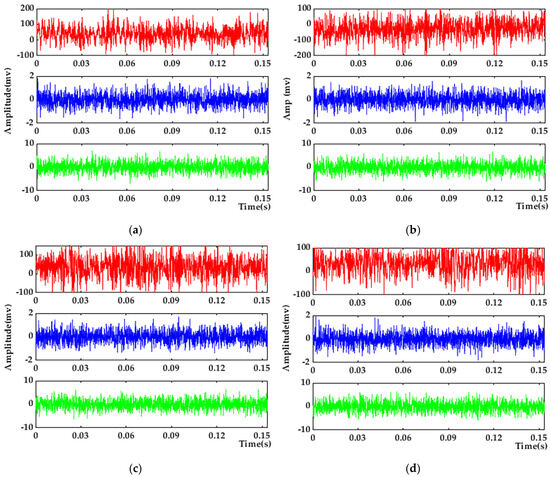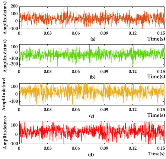 where is the energy of the original signal and is the energy of the noise signal. Gaussian white noise with signal-to-noise ratios of 6 dB and −6 dB is added to the original data. Using the four motor states’ original data and the difference data after adding Gaussian white noise, one of the groups is taken as an example and is shown in Figure 9.
