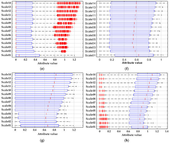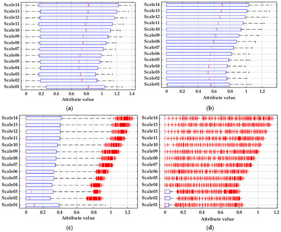 In the table, r is the similarity tolerance threshold, n is the gradient of the similarity tolerance boundary, and sigma is the standard deviation. In order to control the variables and reduce the influence of different variable values on the results, the same variable values are used for the same variables. With an embedding dimension m = 2, when the value is too large, it is easy to cause information loss; when it is too small, it is easy to cause information overlap; with scale factor scale = 14, when the value is too small, it is easy to cause insufficient feature extraction; when it is too large, it is easy to cause feature-extraction redundancy. From the result data in the table, it can be seen that the final recognition effect of WB-MDE is better than other features, and its correct training rate and correct test rate can reach 100%, in which the correct training rate is improved by 2.71–16.88% compared to other methods, and the correct test rate is improved by 4.74–13.93% compared to other methods. Multiscale sample entropy is biased, highly mutable, and lacks continuity. There is too little differentiation in multiscale fuzzy entropy and complexity and invalidity in the calculation of multiscale permutation entropy. Furthermore, multiscale symbolic dynamic entropy is too small to be of use.