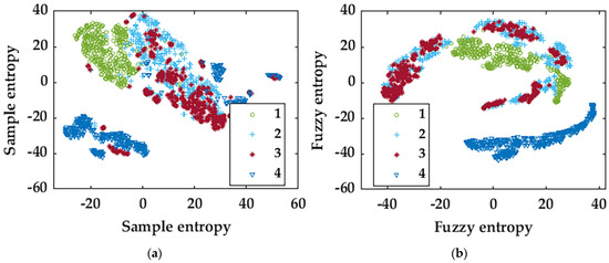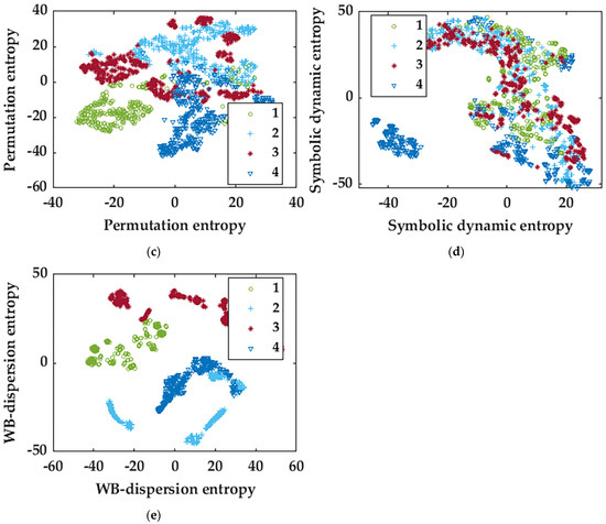 In order to verify the validity of WB-MDE feature extraction, we compare it with multiscale sample entropy (MSE) [21], multiscale fuzzy entropy (MFE) [21], multiscale permutation entropy (MPE) [22], and multiscale symbolic dynamic entropy (MSDE) [23]. Unsupervised learning is used to reduce the dimensions of feature vectors extracted in different ways. The parameters of t-SNE are set as follows [24]: the dimension of embedded space is n-components = 2, and the disorder degree is perplexity = 30. The learning rate is learning-rate = 1000, the maximum number of iterations for the optimization is n-it = 1000, and the maximum number of iterations without progress is n-it-without-progress = 30. The feature results extracted via different methods are shown in Figure 7.