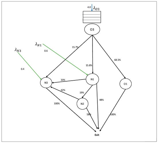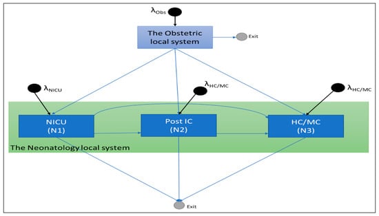As stated earlier, we focus on the flow of newborns in the perinatology care system, as given in Figure 1. Specifically, this includes the neonatal intensive care unit (N1), the neonatal post-intensive-care unit (N2), and the neonatal high-care/medium-care HC/MC unit (N3) from the neonatology local system. And it also involves the delivery room (O3) and the nursery ward (O1) from the obstetrics local system. Based on the performed data analysis for the data of the year 2018, the flow of patients in the care system is given in Figure 3.