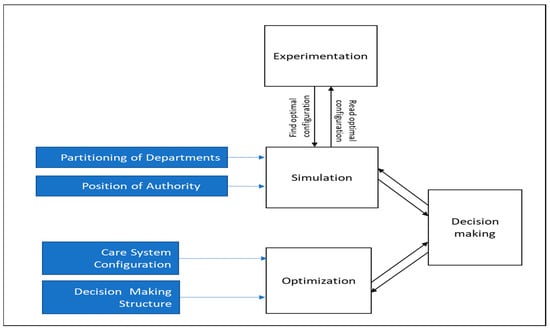 The method of this study is presented in Figure 2. We begin by accepting the current perinatology configuration (i.e., our case study for the care system) with 2 separate departments with 6 units total, whereas 4 units provide care for newborns. This is decided at a strategic level, with a planning horizon of 1–2 years (or possibly longer). At this planning level, the decision-making structure is also defined, following the framework of Sandoe [21] (i.e., the hierarchy strategy).