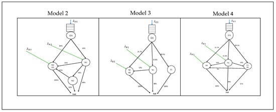 Although the capacity is determined in advance, dependent on the workload of departments, if needed, possible nurses can be temporarily assigned to another department. Each department can be in a state of high, medium, or low workload in an operational time horizon (a day, a shift, an hour). A department can switch staff if one department is in a high-workload state and another in a low-workload state [16]. For instance, if we have a system with four departments, each department has queueing system . If a nurse is reassigned from department 1 to, for example, department 2 for a certain period (e.g., the next two hours), the capacity of the following two queueing systems changes: . does not change in this process. If the variety of services changes, the of at least two departments’ changes.