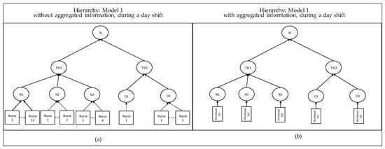 Hierarchy decision-making structure for Models 1, at the day shift. (a) portrays the system with detailed information decentralized at the nurse level, while (b) portrays the system with aggregated information. When units are combined, the nurses from the combined department report to the assigned team manager, depending on the structure given in Models 2, 3, and 4.