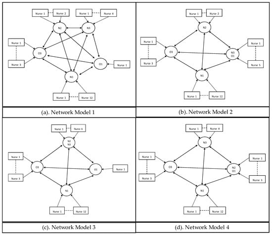 Network decision-making structure for Model 1 (a), Model 2 (b), Model 3 (c), and Model 4 (d).