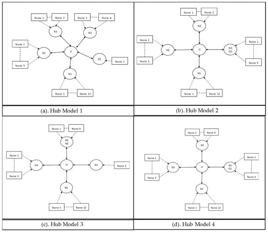 Hub decision-making structure for Model 1 (a), Model 2 (b), Model 3 (c), and Model 4 (d).