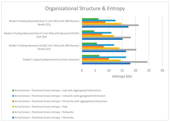 Due to the uncertainty of patient demand prominent in hospital operations, developing capacity planning for short-term planning is essential in developing real-time control of hospital resources. The literature suggests that organizations need to build information processing capability to minimize decision-making delays in organizations [12,22,23]. A given system design follows a specific structure in which information is gathered and processed. An information entropy model can be used to measure the amount of information [14]. Entropy is defined as a measure of randomness or disorder in a system [12,24]. Information entropy values can be assigned to specific structures so that we can compare them to gain insights into the factors that lead to effective decision-making. As the higher the uncertainty in the system, the higher the entropy; consequently, more information is required to understand what is happening in it. Processing too much information will lead to a delay in decision-making.