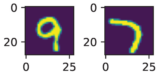 Since the output space has dimension 9, the pullback bundle also has dimension 9. At an input point x, a point in the pullback bundle is a couple with v a vector from at output point . On the other hand, the image of the input tangent bundle (simply a vector space in our case) has points with u an input vector. We are thus considering a bundle mapping where the right-hand term has values in the pullback bundle, equipped with the output Fisher metric. Tensor is computed via singular value decomposition, already implemented in torch. We selected the rotation rate of the singular vector associated with the largest singular value as an indicator of the complexity of the decision process in the neighborhood of an input point. The code was adapted from https://github.com/eliot-tron/CurvNetAttack (accessed on 12 September 2023). A detection of outliers from a sample of 1000 points was performed. A visual analysis reveals that they correspond to poorly drawn digits, as indicated in Figure 2 where the two digits with the highest curvature indicator are plotted: