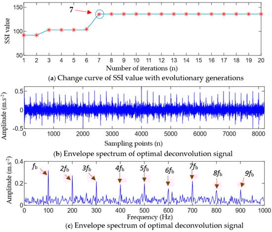 Firstly, according to the principle of parameter selection in Section 3.2, the value ranges of the fault period and filtering length were set as Hz and , respectively. The GWO algorithm was used to solve the optimal parameter combination of MOMEDA. Figure 4a shows the relationship between the SII value of the deconvolution signal and the evolution algebra of the population. It can be seen from Figure 4a that the maximum SII value of the deconvolution signal is obtained when the population has evolved to the seventh generation during the GWO optimization process, and the optimal parameter combination searched is [100, 1375]. Then, the MOMEDA with optimal parameters was used to denoise the signal in Figure 3b, and an envelope spectrum analysis was performed on the denoised signal. The MOMEDA-denoised signal and its envelope spectrum are shown in Figure 4b,c.