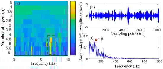 As shown in Figure 3b,c, TVFEMD reconstruction improves the envelope spectrum characteristics of the fault signal to a certain extent, and a part of the fault characteristic frequencies can be extracted. However, in the envelope spectrum of the TVFEMD-reconstructed signal, only and can be extracted, and the amplitude of interference frequency in the envelope spectrum is also larger. Generally speaking, a satisfactory fault characteristic frequency extraction effect is not obtained.
