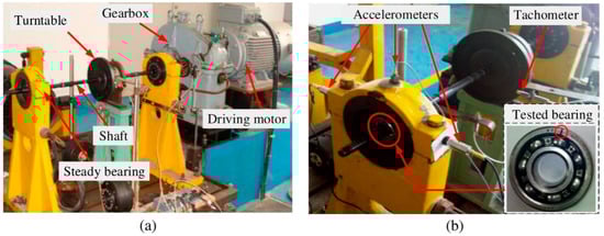 (a) The test rig of the roller bearing, and (b) sensor locations and the tested bearing with an outer-race defect.