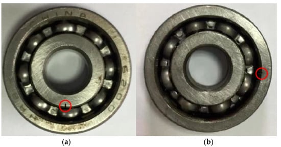 The test bench can simulate the failure of the bearing outer ring, inner ring, and rolling body, and the bearing vibration signal can be obtained via the acceleration sensor. When collecting vibration signals of rolling bearings, the sampling frequency is set at 25,600 Hz, and the characteristic frequency of various fault types can be calculated using Equation (23) according to the bearing parameters: