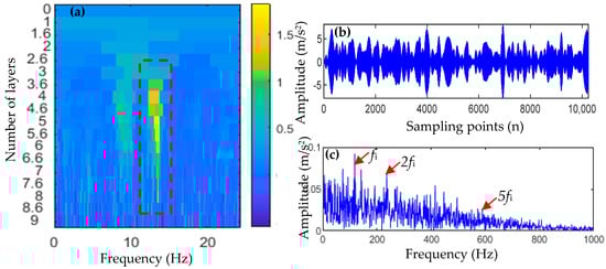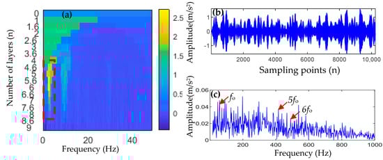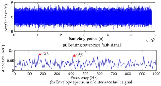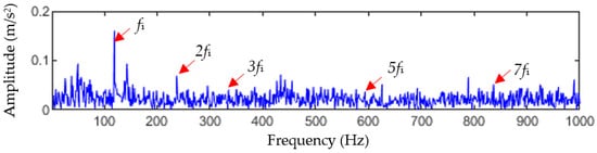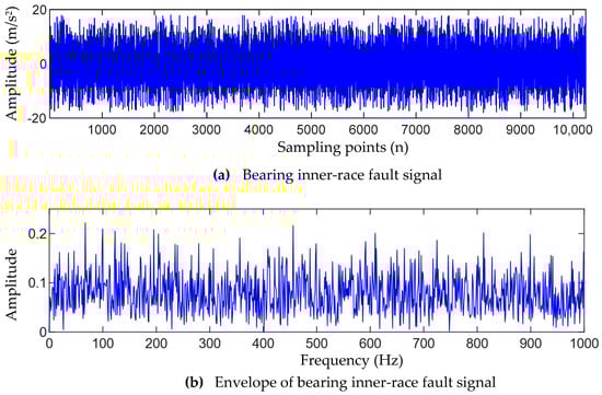 Figure 16a shows the fault signal of the bearing inner race detected by the vertical direction sensor, and Figure 16b shows the envelope spectrum of the inner-race fault signal. From Figure 16b, it can be seen that it is difficult to extract the corresponding inner-race fault characteristic information from its envelope spectrum.