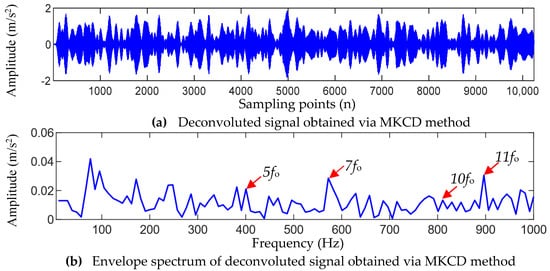 To verify the accuracy of the optimal parameter combination obtained using the method proposed in this article, a certain parameter in A was randomly replaced, and the TVFEMD-reconstructed signal in Figure 3b was processed using MOMEDA after replacing the parameter. Figure 5a,b show the results obtained by changing the filter length in the optimal parameter combination [200, 1375] to 600. Compared to Figure 4b, the results of MOMEDA filtering with = 600 show a significant increase in noise residue and a certain degree of reduction in impact characteristics. In the envelope spectrum corresponding to Figure 5b, only the spectral lines at and are relatively obvious, but the amplitudes of the spectral lines are lower than those in Figure 4c.