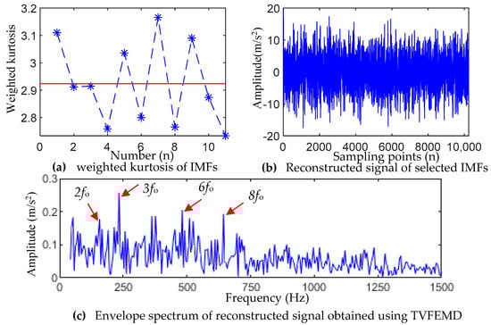 TVFEMD was used to decompose the inner-race fault signal and calculate the weighted kurtosis value of each IMF component, and the results are shown in Figure 17a. IMF3, IMF5, IMF6, and IMF7 were selected to reconstruct the signal, and the envelope spectrum of the reconstructed signal was calculated, with the results being shown in Figure 17b,c. It can be seen that the envelope spectrum of the reconstructed signal can only extract the 1-, 2-, 4-, and 5-order harmonics of the inner fault frequency, and the amplitude of the interference frequency is also large. Therefore, satisfactory results of inner fault frequency extraction are not obtained.