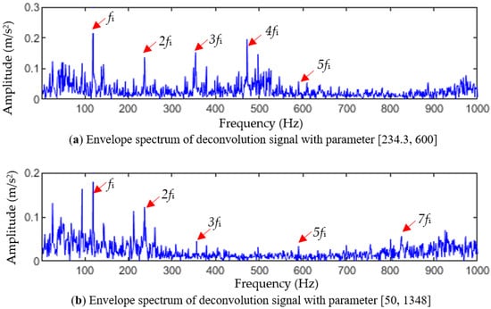 Figure 19a shows the envelope spectrum obtained by denoising the TVFEMD reconstruction results after changing the filter length in the optimal parameter combination [234.31348] to 600. Compared to Figure 18, it can be seen that due to the presence of more noises in the reconstructed signal, the harmonics of the inner-race fault frequency in the envelope spectrum become blurred. Only the inner-race fault frequency and the 2-, 3-, 4-, and 5-order harmonics (, , , ) can be observed, and the overall amplitude of the spectral lines is lower than that in Figure 18.