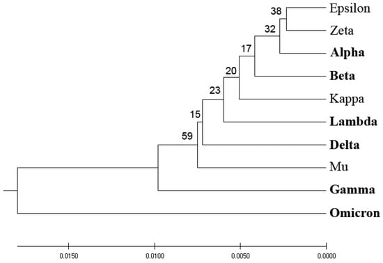 Homology-based phylogenetic analysis of SP1 from VOCs (labeled in bold) and VOIs. The percentage of replicate trees in which the associated taxa are clustered together in the bootstrap test (500 replicates) are shown next to the branches.