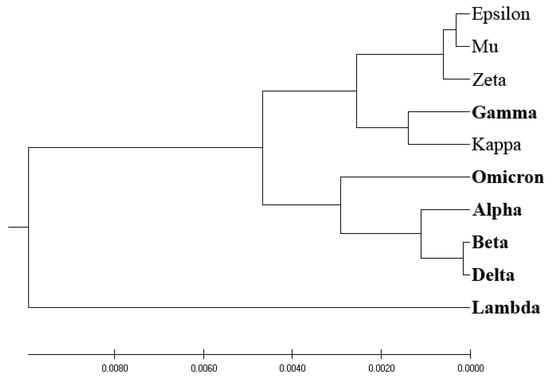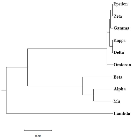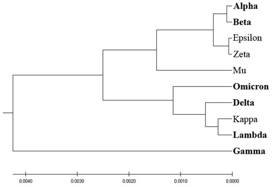 Previously, we designed an Information Spectrum Method (ISM)-based phylogenetic approach that allows the assessment of the biological effects of single mutations and their combinations in proteins []. The ISM-based phylogenetic tree is illustrated in Figure 2. Although this approach somewhat better distinguishes VOCs and VOIs compared to the homology-based phylogenetic approach, a clear separation between the two groups of COVID-19 viruses is still lacking.