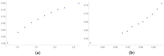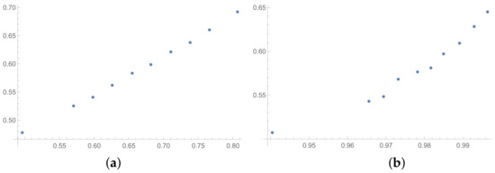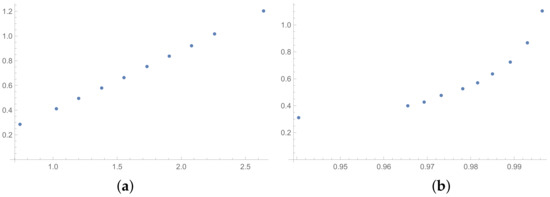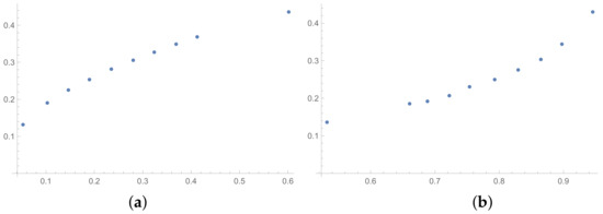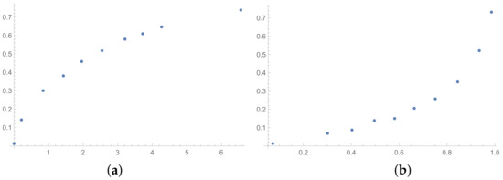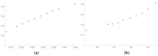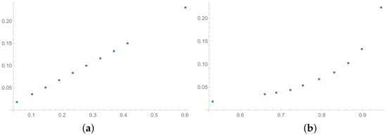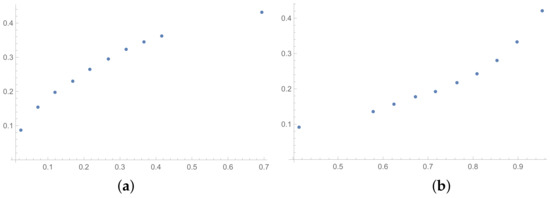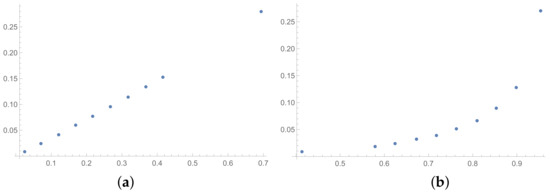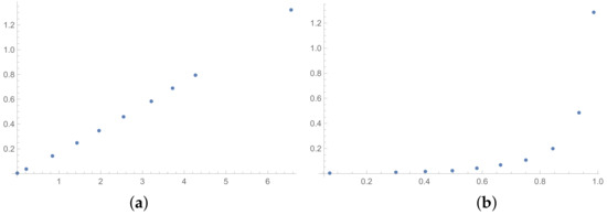In this section, the scatter plots prepared for selected pairs of indices are also presented. The scatter plots for indices calculated for matrices obtained by the BSF are placed in Figure 1, Figure 2 and Figure 3. Although I present scatter plots for only some pairs of the investigated ICIs in this section, the remaining ones can be found in the Appendix B in Figure A1, Figure A2, Figure A3, Figure A4, Figure A5, Figure A6, Figure A7, Figure A8 and Figure A9. One can also request the author of the article to gain access to the normal size scatter plots presented in the Appendix B. Nevertheless, the scatter plots presented in this section and in the Appendix B show the shapes of the relationship between the investigated inconsistency indices.