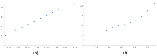 Some differences can also be observed when we compare Figure 4, Figure 5 and Figure 6 with Figure 1, Figure 2 and Figure 3. The plots prepared for matrices obtained by the BSF without a rounding procedure show bigger convexity. Similarly as before, the values of correlation for dependencies shown in Figure 4, Figure 5 and Figure 6 are highlighted in Table 4. We can see lower values in most cases in Table 4 in comparison to Table 1.