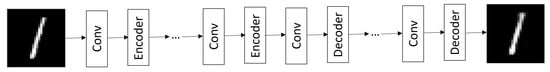 Figure 2. Architecture of the convolutional autoencoder. - The Denoising Autoencoder (DA) is a robust modification of Conv AE that changes the input data preparation. The information the autoencoder is trained in is divided into two groups: original and corrupted. In order for the autoencoder to learn to denoise an image, the corrupted information is sent to the input of the network to be processed. Once the information is in the output, it is compared with the original []. This type of autoencoder is capable of generating clean images from noisy images, ignoring the type of noise present as well as the density in which the image was affected.