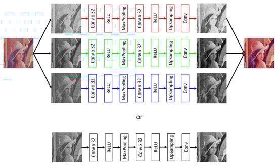 Currently, there is a growing interest in the use of artificial vision systems for application in daily tasks such as industrial processes, autonomous driving, telecommunication systems, surveillance systems, and medicine, among others []. Recent developments in the field of artificial vision have stimulated the need to make increasingly robust systems to meet established quality requirements, which is an essential part of why systems fail to cover these types of requirements, mainly in data acquisition. Among image acquisition systems, there are several factors that can alter the result of the capture, including failures in the camera sensors, adverse lighting conditions, electromagnetic interferences, noise generated by the hardware, etc. []. All of these phenomena are described using distribution models and are known, in a general way, as noise. The procedure in the image processing field to try to diminish the effect of the noise is known as the pre-processing stage in any image processing system. In recent years, various algorithms have been developed in denoising images, and recently, a new field has taken much interest in the scientific community. In this way, deep learning methods emerge [,].