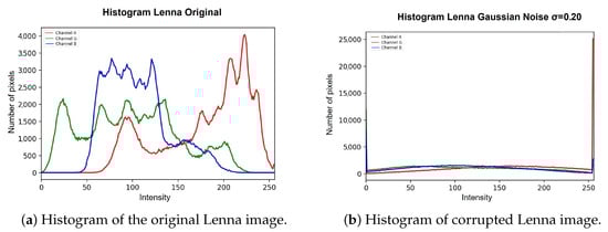 For the multimodal model, the image is separated into its three different components (red, green, blue), and each component is processed independently, with models trained for each type of channel (Equations (2)–(9)) so that once the result is obtained, the three new ones are concatenated. The components generate a new image in which the noise is smoothed out. Within the unimodal model, a single trained model is applied. The main reason why a multimodal model was trained for RGB-type images is because the noise, being completely random and defined by a Gaussian probability, means that each channel is affected differently. In this case, processing the three channels of the image in the same way can cause the final smoothing to not be carried out properly and contain a greater number of corrupted pixels. Figure 4a shows the original histogram of the Lenna image, and Figure 4b shows how the image behaves when corrupted with Gaussian noise with density . This example is perceived as the red channel tends to increase the intensity of its pixels, and in the case of both the green channel and the blue channel, their intensities tend to decrease.