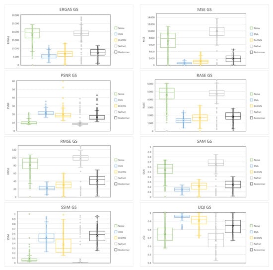 Box-and-Whisker plots of the quantitative results obtained on GS images.