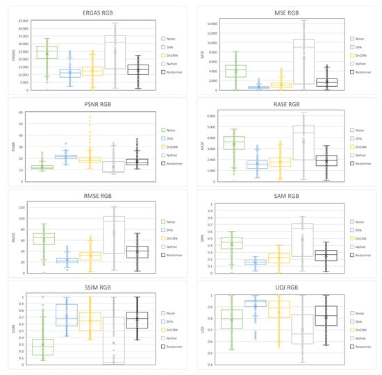 Figure 8 shows the Box-and-Whisker plots for each of the metrics applied to the results of the GS images, and Figure 9 also shows the plots for the RGB image results. In each of the diagrams, it can be seen that the DVA contains smaller box dimensions with respect to the other networks, which means that the results obtained oscillate in a smaller range, so the result of the processing is similar regardless of the density with which the image is corrupted. The median is also located near the center of the box, which indicates that the distribution is almost symmetrical. Another point to highlight in the diagrams is that there are fewer outliers in the DVA compared to the other networks.
