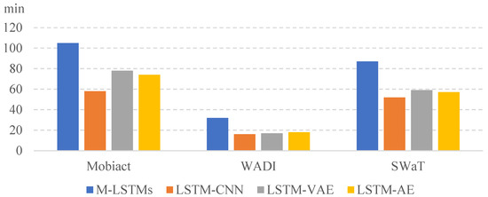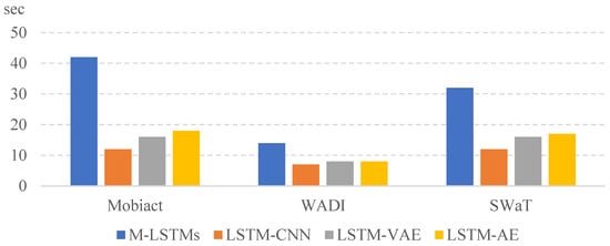Figure 4 and Figure 5 show the results of the training and testing time measured for the three datasets, Mobiact, SWaT, and WADI. The training time for each model was long to short in the order of M-LSTMs, LSTM-VAE, LSTM-AE, and LSTM-CNN. Depending on the computation complexity, if is doubled, the learning time is about four times longer. The unit of training time is a minute and that of the testing time is a second. We split 70% of the total data for training and used the remaining 30% for testing. The computing settings of our all experiments are two RTX 3090 GPU cards with 128 GB RAM using Tensor Flow version 2.8.0. We notice that the M-LSTM runs took the longest to train, which is naturally understood because the model builds an ensemble of neural networks in its training. However, we also notice that the absolute in-total testing run times of the models are not significantly different, with all executions taking place in less than a minute. This means that the proposed model, once built, runs quite fast compared with the other models. This is important since most computational overhead in a real-world application will be devoted to testing the real-time data for anomalies.