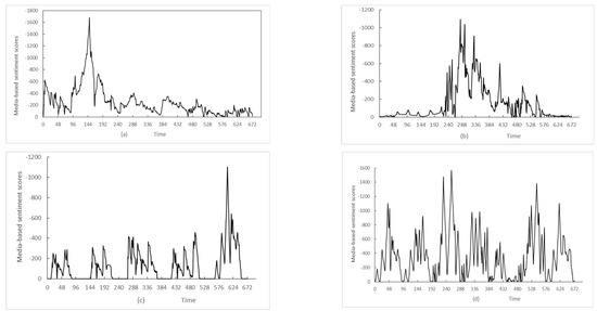 The sample data source of this paper are the media reports of selected 30 host countries who attract the largest amount of China’s ODIs. The countries include Singapore, Indonesia, Malaysia, Thailand, Viet Nam, Pakistan, United Arab Emirates, Cambodia, Serbia, Bangladesh, United States, Germany, Laos, Switzerland, United Kingdom, Russia, South Africa, Spain, Japan, Brazil, Turkey, Italy, New Zealand, Kenya, Uganda, Egypt, India, Guinea, Nigeria, Kuwait, Mauritius, and Tanzania. All relevant media coverage for China’s ODI events in the 30 countries are downloaded from GDELT Event Database from 1 January 2014 to 30 December 2022 (https://analysis.gdeltproject.org/index.html (accessed on 25 January 2023)). Python 3.5.0 is used for pulling the POR data via Google BigQuery. If the tone of the media coverage for China’s ODI events is negative, give it a score −1. Adding the negative tone scores of all media reports referring to an event at a frequency of 1 h/time, we can obtain a POR time series. Figure 1 shows the main four types of POR evolution of China’s ODI events judged by our discriminative model.