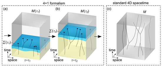where G is the gravitational constant and c the speed of light and where the appearance of emphasizes that the energy–stress tensor and the spacetime curvature expressed by become -dependent objects. Establishing a connection between these curved spacetimes is much more challenging but may be realized, for example, with the procedures developed by Land [21,22,23]. Additionally, a more advanced evolution law for the hypersurface in curved spacetime is needed, and worldlines must be geodesics between local interaction events in order to satisfy conservation of momentum. Furthermore, the above-mentioned worldline-based replacement for quantum theory should be extended towards curved spacetime. Together, such a generalized 4+1 formalism could enable a unified understanding of gravitational observations aligned with general relativity, quantum phenomena, and the passage of time, forming a compelling foundation for a theory of quantum gravity. Returning to the problem of time mentioned in the Introduction, it is not unexpected that a modification of the concept of time plays a pivotal role in achieving this unification.