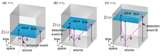 Illustration of an EPR experiment in the 4+1 formalism. In (a), at , two entangled photon worldlines A and B are created in an emission event. In (b), at , Alice has performed a measurement on photon A. This measurement produces a deterministic influence, which propagates along the photon worldlines as a function of , from Alice to Bob, as indicated by arrows. This influence affects both the past region of spacetime and spatially distant regions in the present. In (c), at , Bob performs a measurement on photon B. In this way, the outcome of Bob’s measurement depends on the outcome of Alice’s measurement, even though his measurement occurs in a spatially distant region.