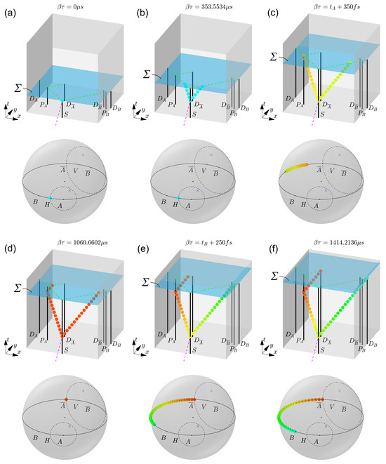 Simulation result of the EPR model in the 4+1 formalism, for the case of an initial state of the entangled photons A and B. At six increasing values of (a–f), the spacetime configuration of worldlines is shown (top) and the polarization states along the photon worldlines are indicated on the Poincaré sphere (bottom). In (a,b), entangled photons A and B are created and travel, respectively, towards Alice and Bob. In (c), photon A interacts with PBS , inducing a change in the polarization state across both entangled worldlines. Since hidden variable (blue cross) is located inside the circle around A on the Poincaré sphere, the polarization state of photon A is attracted to the state . In (d), both photons have collapsed to the state , and photon A is deflected towards detector . In (e), photon B interacts with PBS . Since hidden variable (red cross) is inside the circle around , photon B is attracted to the state B on the Poincaré sphere. In (f), the final configuration is shown when photons A and B are detected, respectively, by and , leading to an outcome . Similar results can be obtained for the initial state , for different settings of the polarizing beamsplitters, or for different choices of the hidden variables.